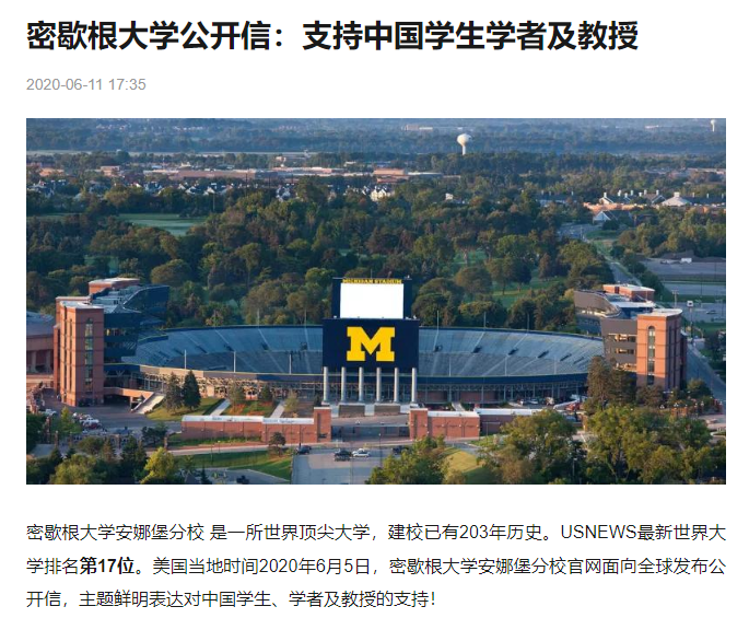 密歇根大學發佈公開信,支持中美兩國深度學術交流。
