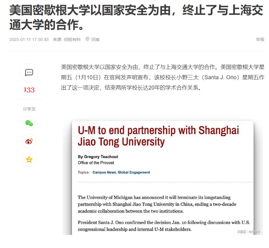 突發,美國密歇根大學以國家安全為由,終止與上海交通大學的合作: