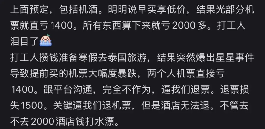 原定一月中旬到泰國旅遊的網友藍懶懶,在王星事件發生後,第一時間就全額退票了。