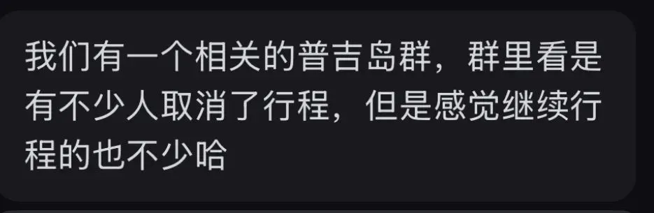 取消了行程的藍懶懶也説,她所在的普吉島旅遊羣中,還是有很多人按原計劃旅行。
