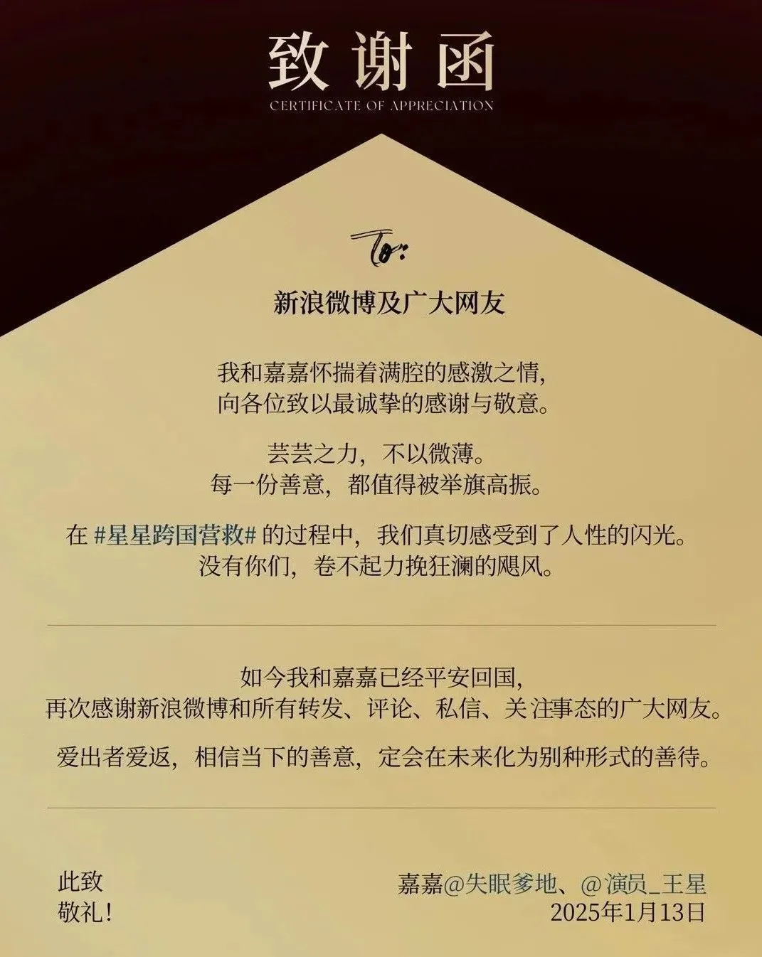回國的第二天,王星和女友嘉嘉在新浪微博發出一封致謝函,感謝了網友們對他的關注和幫助。