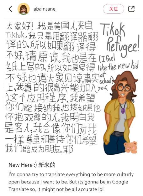 不少新註冊的用户,一面學習小紅書的使用方法,一面藉着翻譯器,向“原住民”留言:“你好”“很高興”“請見諒”。