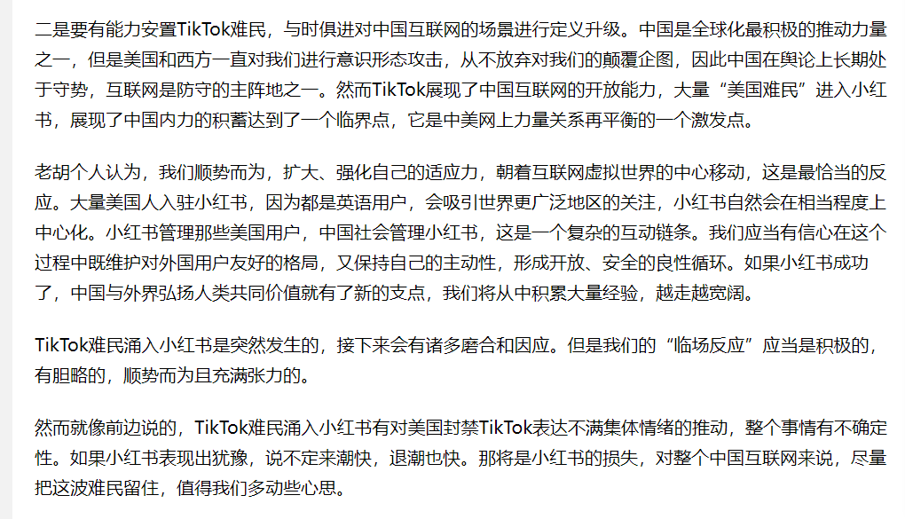 正如胡錫進説的,有沒有能力安置tiktok難民,要與時俱進對中國互聯網的場景進行定義升級。