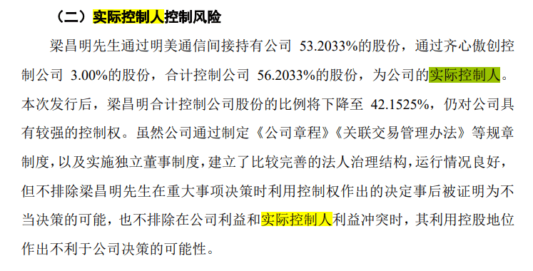 目前明美通信直接持有明美新能源6,786.7172萬股,佔發行前總股本的53.2033%,為明美新能源的控股股東。而梁昌明合計控制明美新能源7,169.4094萬股股份,佔發行前總股本的56.2033%,為明美新能源的實際控制人。