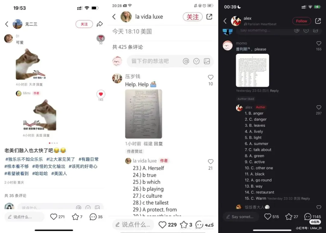互鬥表情包迅速讓中外網友打成一片。貓咪表情包已經成為小紅書國際交流的硬通貨。留學生、先前入駐的老外們則開闢出教外國人玩小紅書、學中文的新賽道;同時,拼多多用户也抓住“薅洋毛”機會,給外國人發“砍一刀”教程;