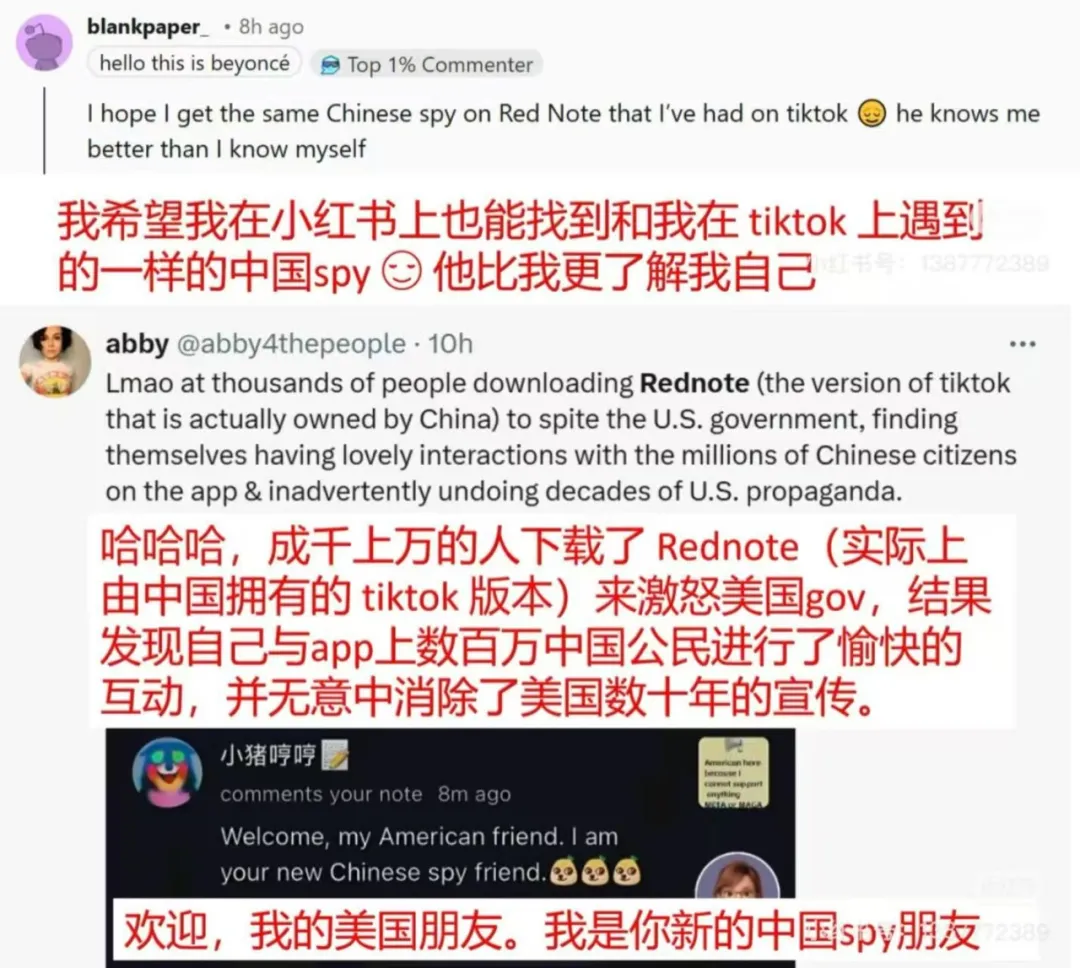 據洋抖難民的解釋,他們此舉是為了抗議美國政府的禁令。因為美國政府稱中國APP竊取美國人的隱私,威脅國家安全。**他們則逆反地選擇進入一款真正的中國APP——小紅書,向中國人送上自己的隱私。**所以,咱們可以看到很多洋抖難民一上小紅書就發“hi,my Chinese spy”。
