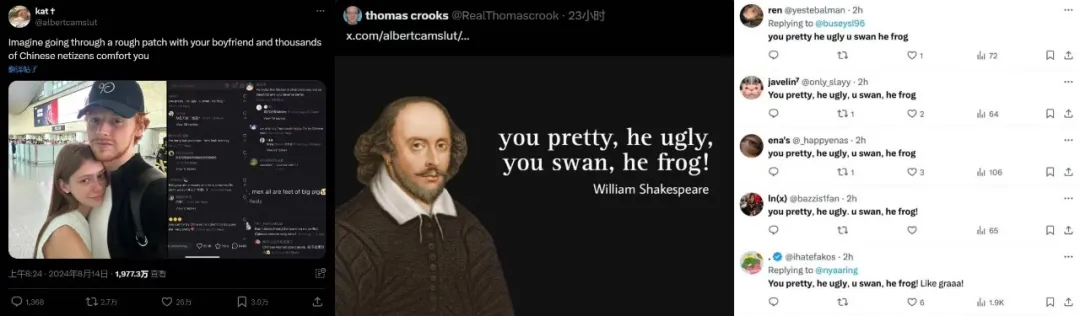 最有名的事件當屬外國美女博主YourKris告別男友貼,小紅書網友盡顯Chinglish(中式英語)造梗才華,一句“you swan he frog”(癩蛤蟆想吃天鵝肉)從內網火到外網,老外直呼“媲美莎士比亞”。