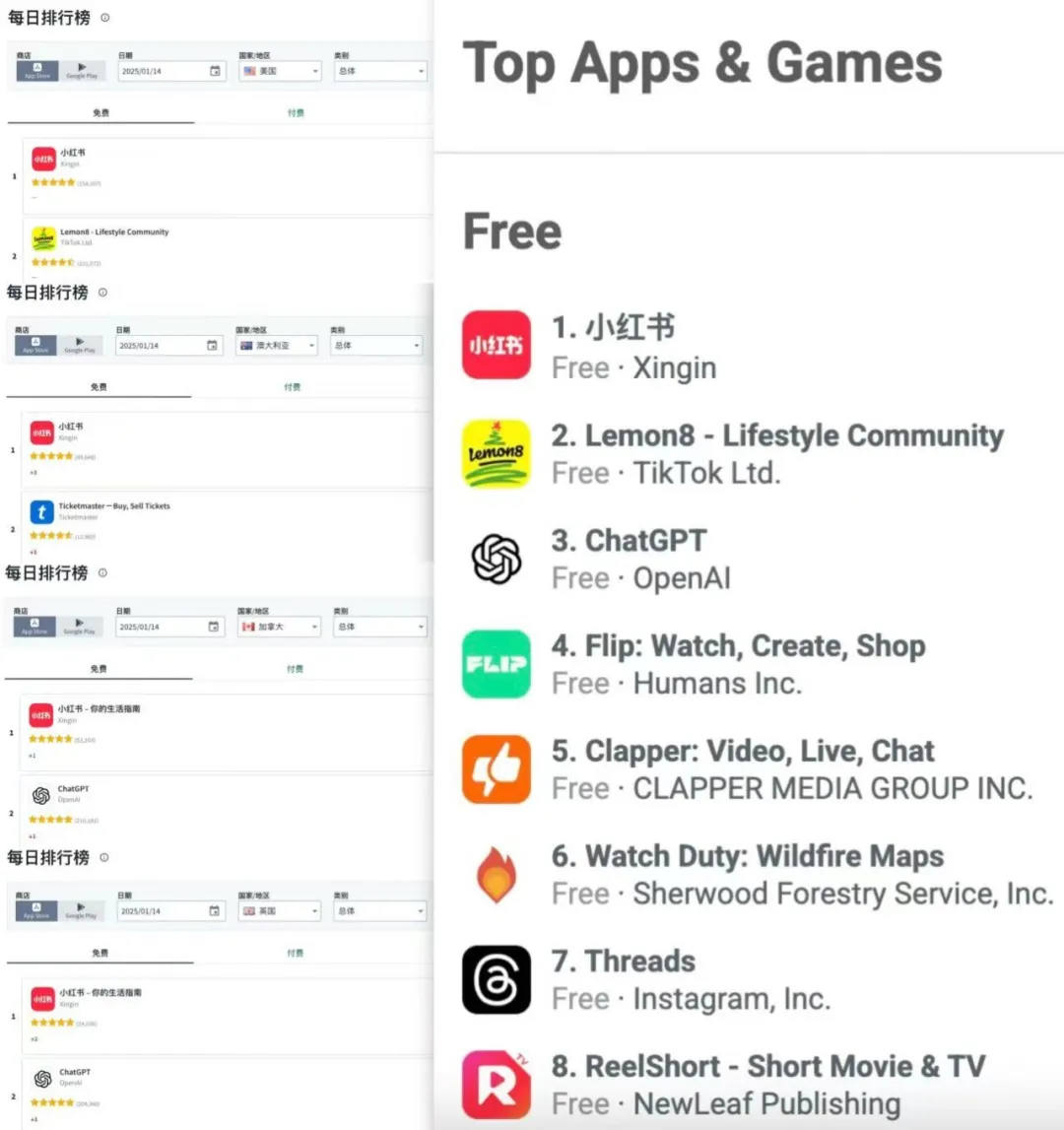 但意外的是,很多Tik Tok用户似乎跑錯片場,大量湧入了中國的小紅書主場。不是小紅書的海外版,而是我們使用的這個中文logo、中文名稱、中文內容的正版小紅書。根據移動應用情報平台Sensor Tower數據顯示,1月14日,小紅書在蘋果免費應用商店的下載量超過了 lemon8,登頂美國、加拿大、英國、澳大利亞、新西蘭地區第一。
