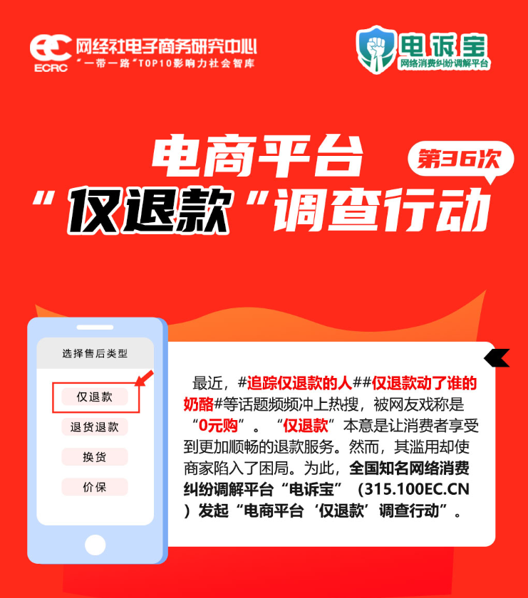這也是國內首次由第三方維權平台和媒體智庫共同發起的電商行業“僅退款”調查。本次行動通過線索徵集、案例披露、滾動播報、專題聚焦、重點督辦、平台評測、專家調研、法律維權、報告發布、移交上報等十大方式,從平台層、商家層、消費者層,對“僅退款”服務的相關糾紛進行調查。