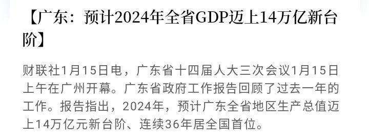 剛剛,廣東省人代會披露最新經濟數據,2024年廣東GDP預計站上14萬億大關,成為我國第一個14萬億大省,連續36年蟬聯全國榜首。