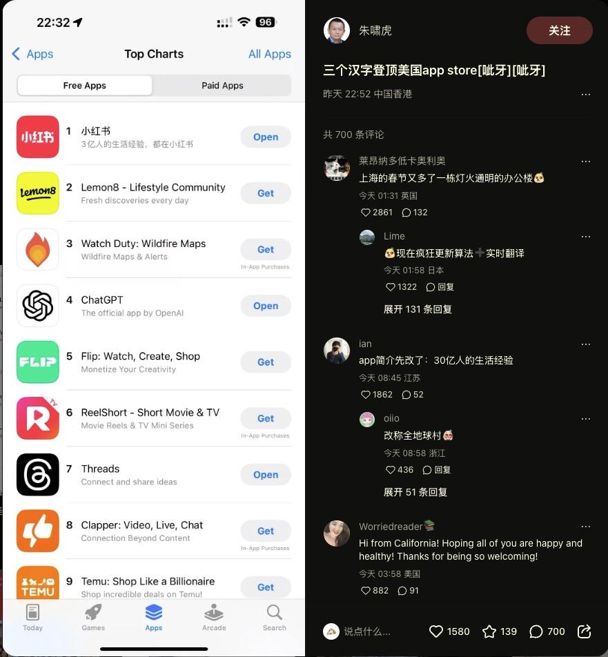 樂觀者認為,這是一直追求國際化的小紅書在國際化營銷層面的成功。因為小紅書是美國應用商店中為數不多的中國應用之一,小紅書 App 登頂蘋果美區應用商店免費榜,這使得小紅書在美國市場的知名度和影響力迅速提升。