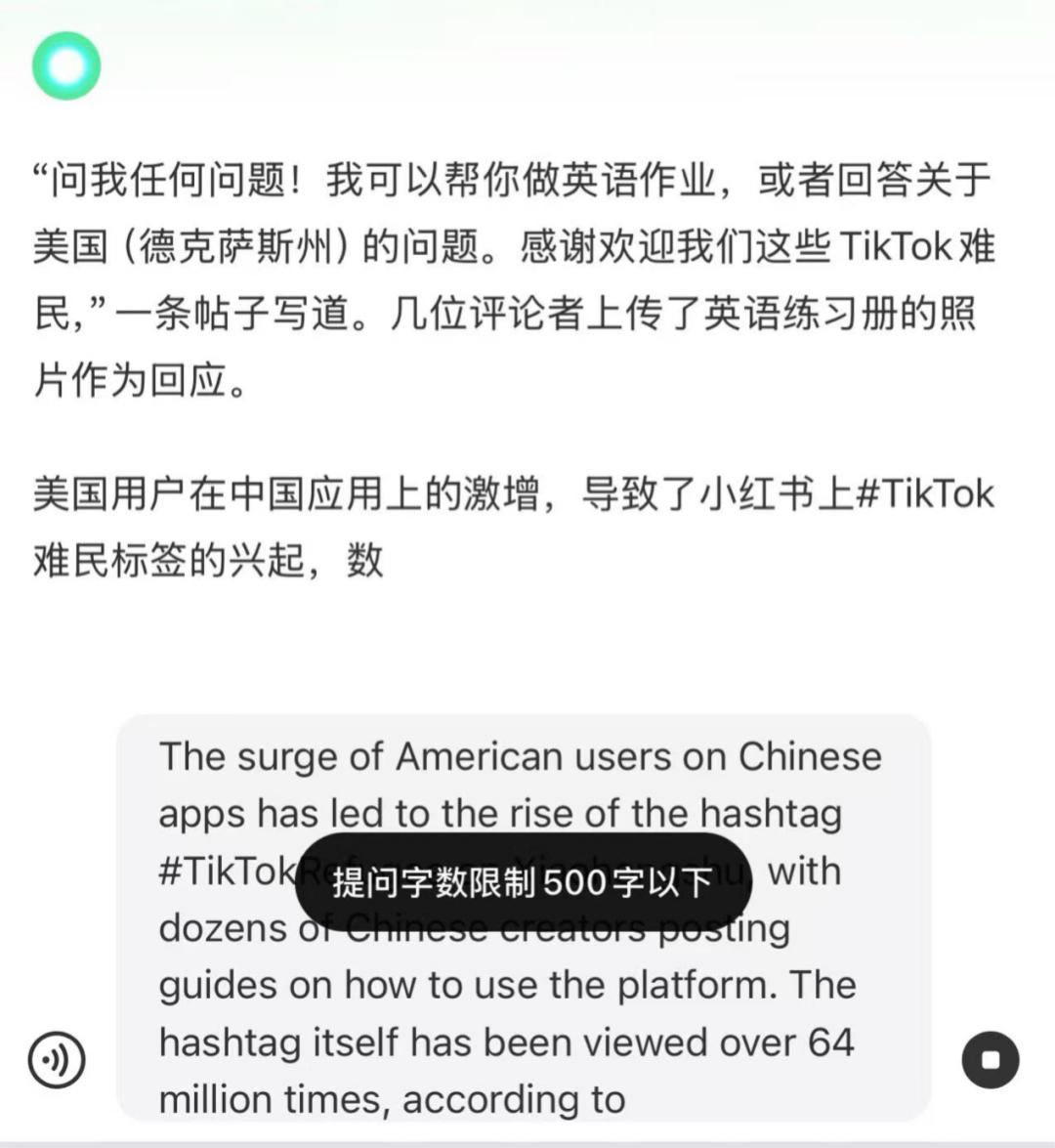「點點」可以實現市面上大模型都能實現的即時文字翻譯能力,但最明顯的弱點在於文本數量,目前點點只支持簡單提問,如果輸入內容過長,則會提示「提問字數限制在 500 字以下」,也就是説,如果要實現長文本的翻譯,「點點」並不能一次性滿足,需要多輪對話,而同類型的豆包、Kimi 都早已經實現了長文本能力。