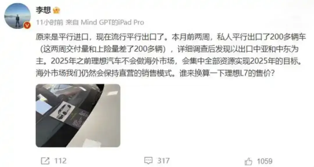 早在2023年7月,李想就透露“本月前兩週,私人平行出口了200多輛車,出口以中亞和中東為主。”