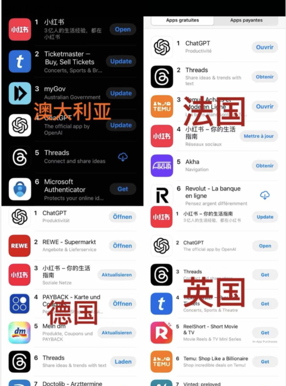 或許吧?這的確是一次突如其來的親密接觸。典型的美國"TT難民”確實是出於對美國政策封殺tiktok的反抗,以及對Instagram Reels、YouTube Shorts等競品的牴觸情緒,"#fxxk zuck"甚至成為禁令事件後的熱門標籤。但也要看到,小紅書下載量在多個國家和地域都出現飆升,這次熱潮並非單純是美國用户的行為。