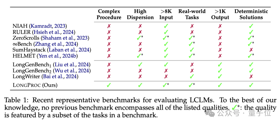 從表1中各測試基準的對比可以看出,只有LONGPROC基準同時滿足6個要求,包括複雜的流程、要求模型輸出大於1K tokens、且提供確定性的解決方案等。