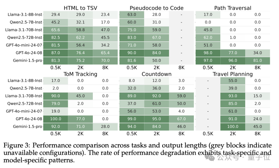 不過,在某些8K任務上,中等規模的模型表現很不錯,比如Gemini-1.5-pro在HTML to TSV任務中就超過了GPT-4o,Llama-3.1-70B-Instruct、Qwen2.5-72B-Instruct在8K的Countdown遊戲中也與GPT-4o相差不大。