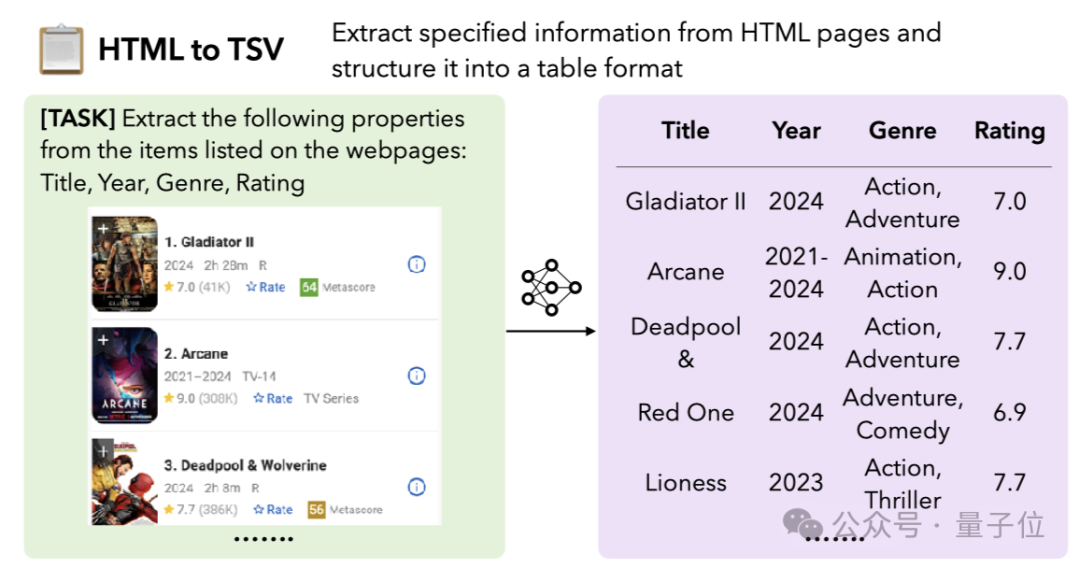 1.HTML到TSV:要求模型從HTML頁面中提取指定信息並格式化為表格。需要從複雜的HTML結構中穩健地提取所有相關信息,並將其正確格式化。
