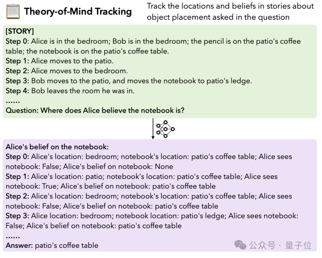 4.Theory-of-Mind跟蹤:要求模型跟蹤故事中對象位置的思想變化。需要進行長距離的推理,以準確反映對象在不同時間點的位置和狀態。