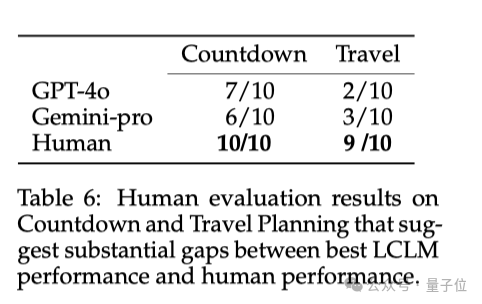 人類在Countdown遊戲和旅行規劃任務中分別解決了10個和9個問題,而最好的模型GPT-4o分別只解決了7個和3個問題。