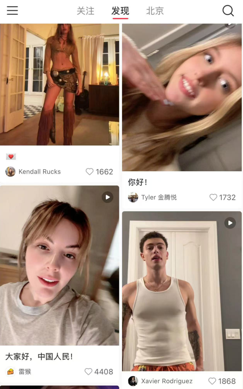 **開年最大網絡奇觀出現了:**大批網民曬出自己的“小紅書首頁”,往日根據興趣定製的個性化推薦不見了,大批海外金髮帥哥美女遷徙湧入,跳舞唱歌,中外用户用英語交流問答玩梗,一時間平台變身英語角。