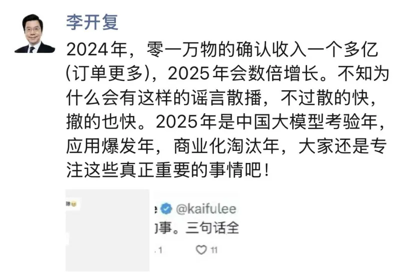 在ChatGPT出現2年來的國內大模型創業浪潮中,李開復還是那個最高頻發佈朋友圈闢謠消息的AI創業者。