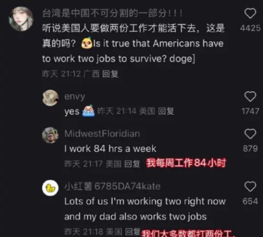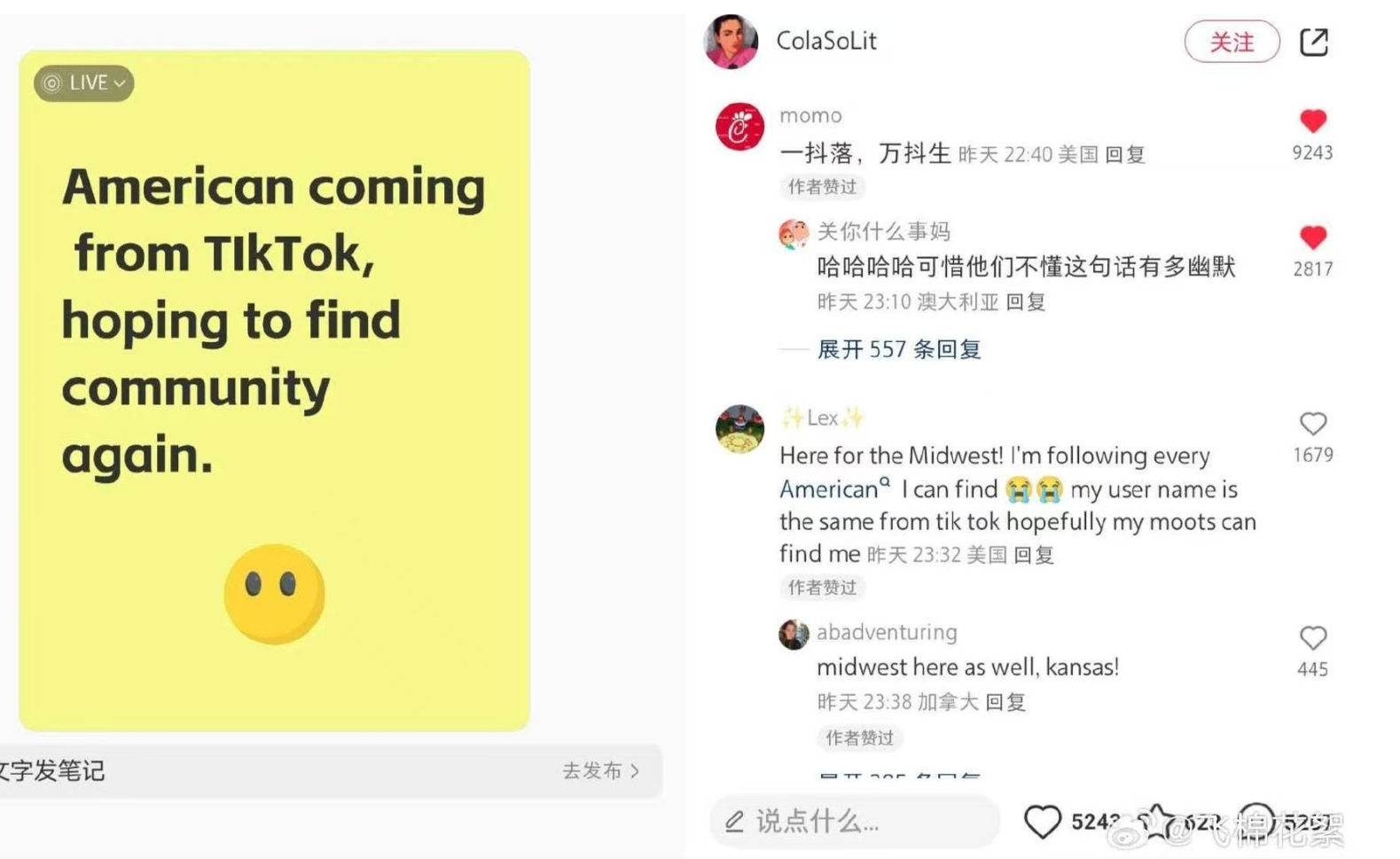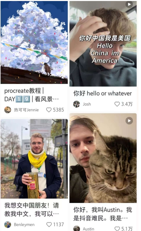 在小紅書上發生了很多有趣的故事。比如中國人幫老美做起了數學考卷,美國人幫忙做起了英語作業;比如雙方開始了全方位的比對,對完收入、醫療又來對學費、飲食;總而言之大部分“TikTok 難民”沒有選擇Tiktok在美國的競爭對手平台,諸如美國人常用的Youtube、Instagram等,而是扭頭奔向了中國的小紅書,一場盛大又魔幻的中美民間交流,就這麼猝不及防地碰撞開了。
