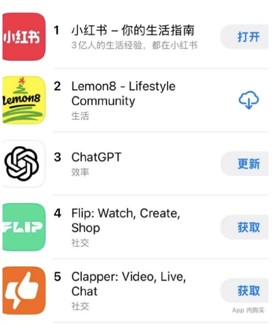 在美區APP Store中,出現了一個全是漢字的應用——小紅書。1月14日,小紅書已經躍升至下載榜第一,緊隨其後的是字節跳動在海外的照片分享應用Lemon8和OpenAI的ChatGPT。