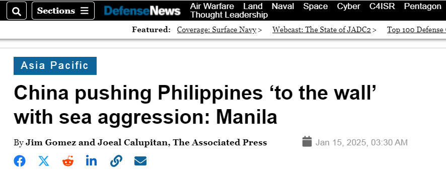 還有菲律賓媒體透露,由於相關海域風高浪急,“特蕾莎·馬格巴努阿”號巡邏艦在持續跟蹤時出現機械故障被迫返回,而中國海警船則依然“閒庭信步”——這也是菲律賓方面如此急着向西方哭慘的原因之一。
