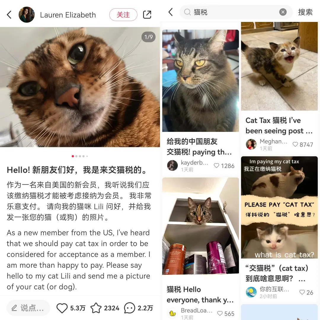 無數湧入小紅書的美國人,正在向小紅書的中國本土用户納“貓税”——最早進入小紅書的美國網友發帖詢問怎麼能友好交流,有中國網友評論,想要玩轉小紅書,那就要多發自己家的可愛小貓給大家看。消息再傳回美國,就成了納貓税,一張貓貓照片,就是打開小紅書這個社交平台的鑰匙。