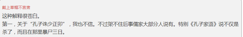但歷代反孔人士,特別是在批林批孔時期,都把“誅少正卯”當作孔子的主要罪狀扭住不放,還蔓延到了現在,當然不會説它是假的。反而還時不時煞有介事地把它拿出來炒作一番。就像圖中“戴上草帽不言肅”先生,他也不信孔子會誅殺少正卯,但他還是要用這個杜撰的故事來攻擊孔子。
