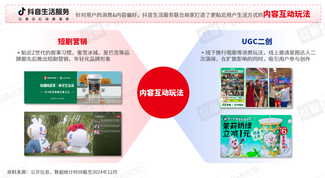 內容互動方面,抖音生活服務推出的短劇營銷、UGC二創、直播間內容形式創新等方式,受到星巴克、蜜雪冰城、霸王茶姬等多個現制飲品品牌的青睞,也迎合了現制飲品消費羣體的喜好,有利於提升品牌營銷活動的吸引力與影響力。