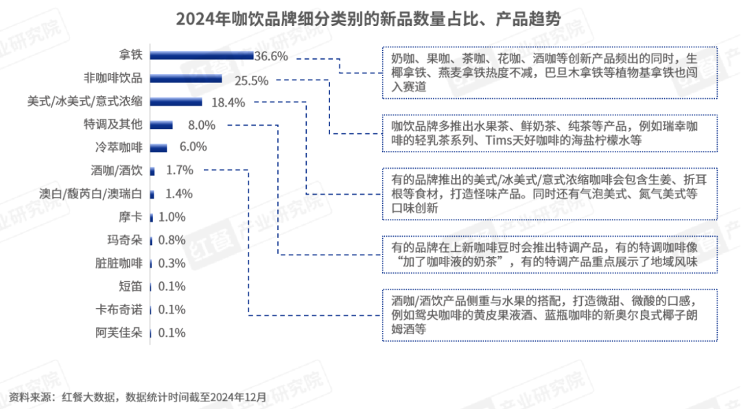 咖飲方面,2024年咖飲品牌推出的新品中,非咖啡飲品的數量佔比為26.3%;星巴克、Peet’s Coffee皮爺咖啡、藍瓶咖啡、Tims天好咖啡等品牌則推出了低咖啡因咖啡產品。