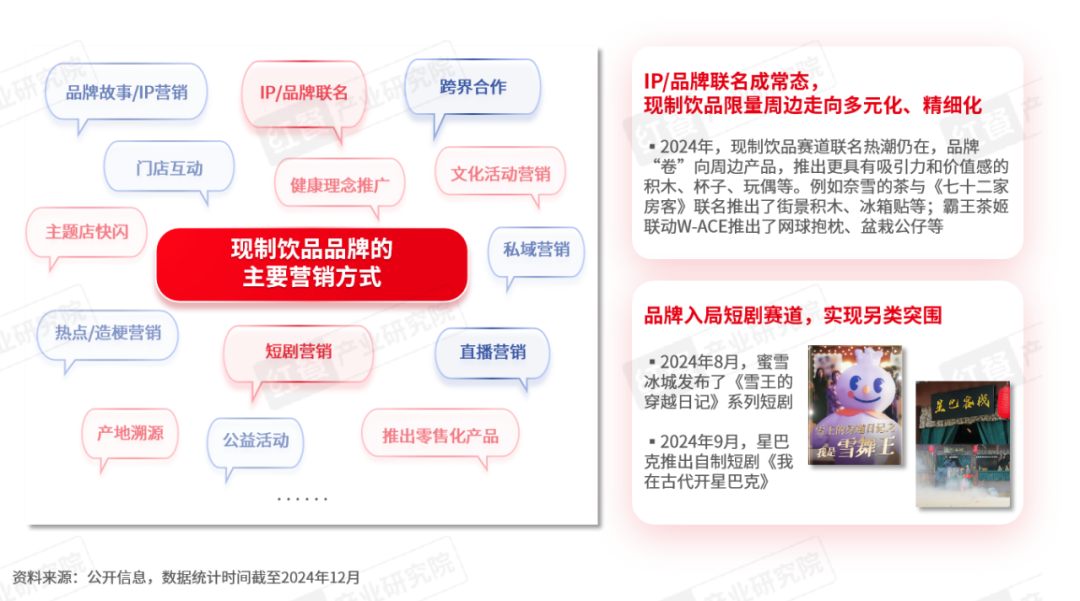 在品牌營銷方面,現制飲品品牌的玩法多樣,例如跨界合作、品牌故事/IP營銷、主題店快閃等。在產品上新時,品牌通常“多管齊下”,線上線下“雙輪驅動”,採用IP/品牌聯名、跨界合作、健康理念推廣、短劇營銷、直播營銷、主題店快閃等熱門營銷方式。