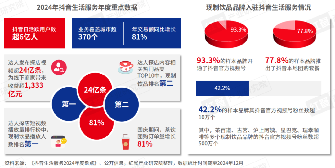 當前,抖音生活服務已成為現制飲品品牌日常經營的重要“生意場”。據官方公開信息,抖音日活躍用户數超6億人。在這巨大的流量場上,2024年度達人探店這一類目中,現制飲品在播放量排行榜中位列第一,在內容相關熱門品類中位列第二;此外,2024年國慶期間,茶飲團購訂單量增長81%,增幅明顯。