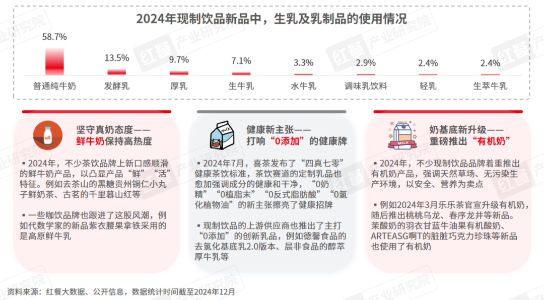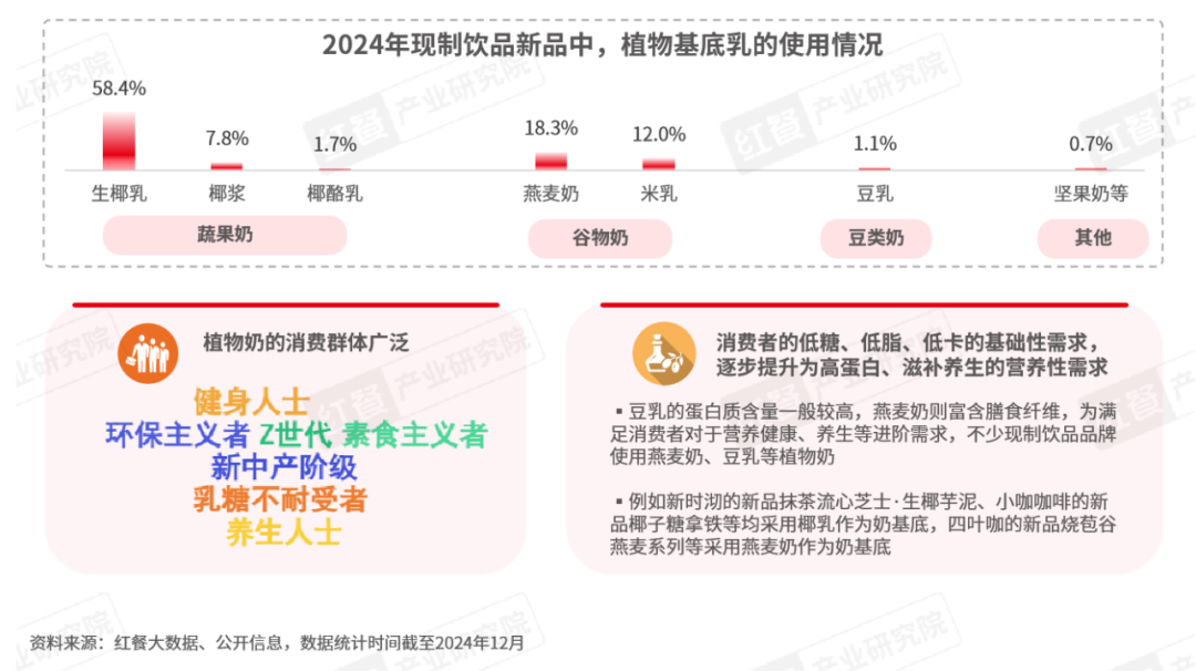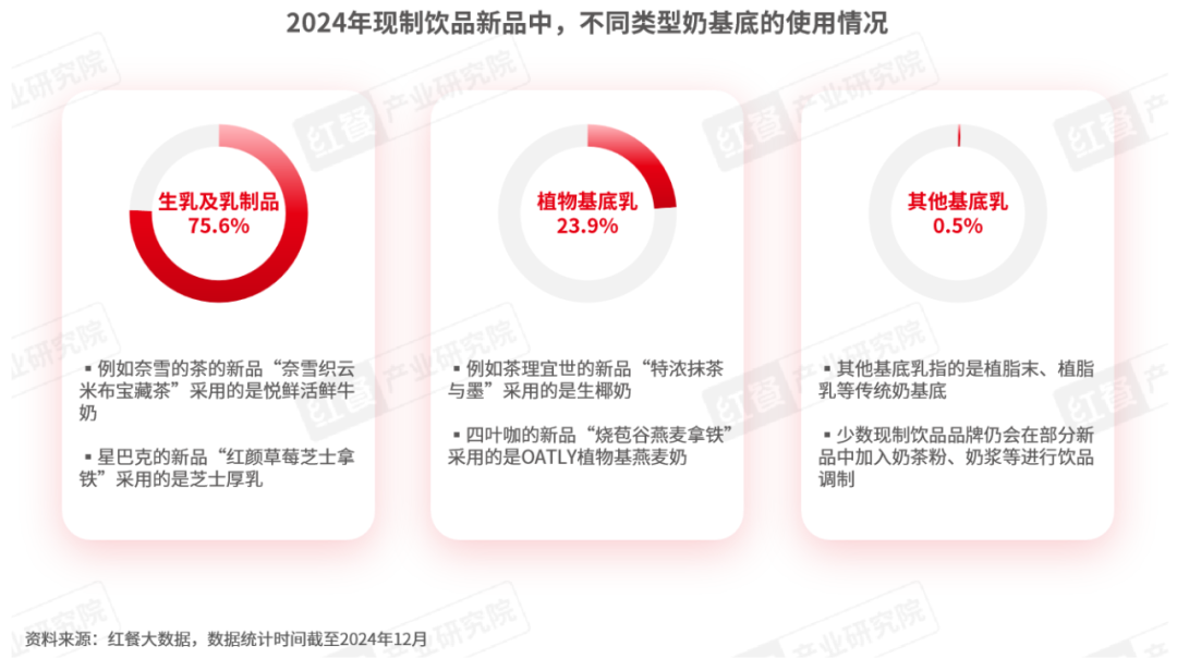 據紅餐產業研究院統計,在2024年加入了奶基底的現制飲品新品中,生乳及乳製品的使用最為廣泛,數量佔比達到了75.6%,大多數現制飲品品牌都有所應用;植物基底乳也正在崛起,新品應用數量佔比達到了23.9%。