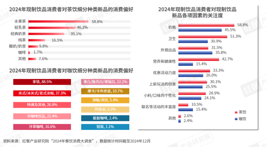 針對現制飲品品牌推出的新品,消費者的偏好則有所差異。紅餐產業研究院“2024年餐飲消費大調查”結果顯示,茶飲消費者更關注茶飲新品的價格、衞生、營養和健康性,佔比分別為58.8%、51.3%、42.7%,一杯茶飲的品質和健康度對消費者決策的影響程度正在加深;咖飲消費者同樣也對新品的價格最為敏感(佔比為45.5%),同時他們對咖啡的外觀出品也有一定的要求(佔比為35.8%)。