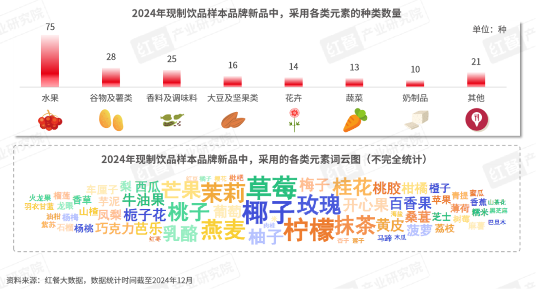 據紅餐產業研究院不完全統計,2024年現制飲品樣本品牌推出的新品中,一共應用了201種元素。從細分類別來看,水果、穀物及薯類、香料及調味料是品牌新品中添加種類最多的元素,共有76種水果、29種穀物及薯類、25種香料及調味料被現制飲品品牌在上新時所使用。