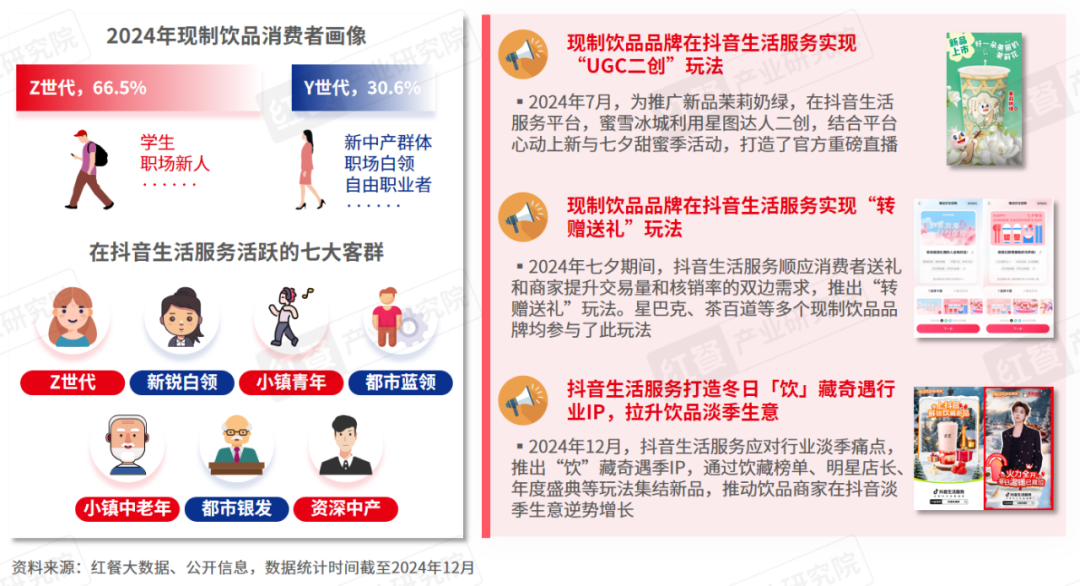 據紅餐大數據,現制飲品消費者多為學生、職場新人、新中產羣體、職場白領等角色。縱觀在抖音生活服務活躍的七大客羣,與現制飲品的消費羣體有不少重合之處。此外,抖音生活服務集內容、商品和服務於一體,已經成為不少現制飲品品牌上新的“主陣地”。