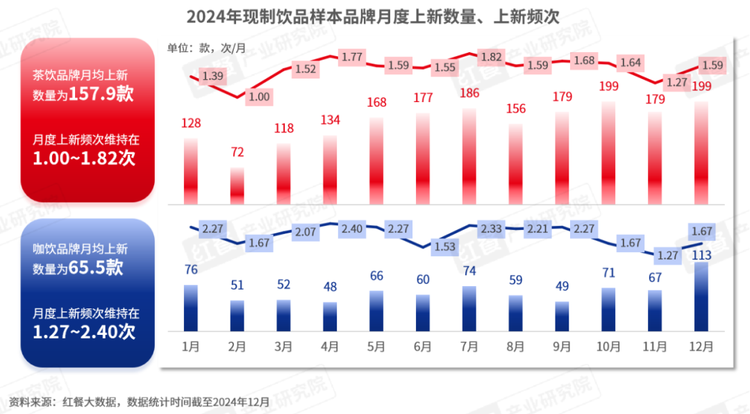 從月度數據來看,2024年茶飲品牌在入夏、深秋、入冬季節的新品數量較多,月均上新超150款產品;咖飲品牌則集中在盛夏和冬季發力,尤其會在年底針對聖誕節、跨年夜等重要時間節點推出暖冬飲品。