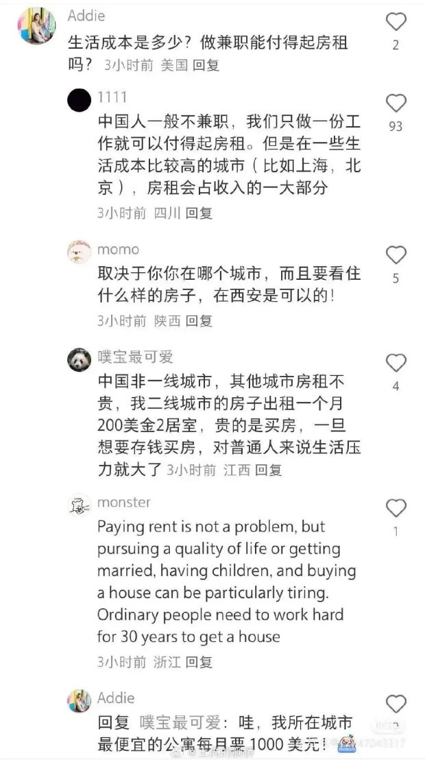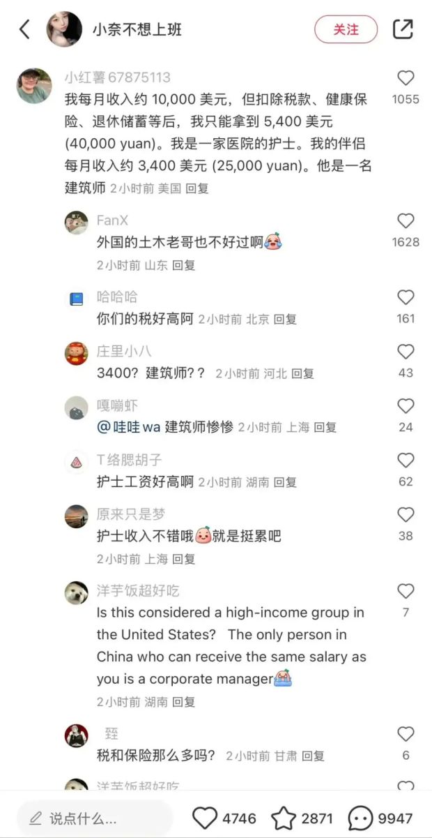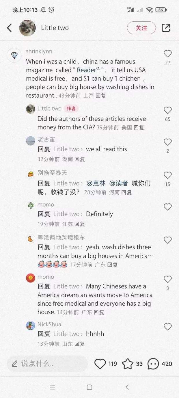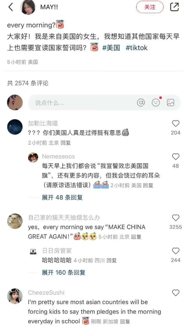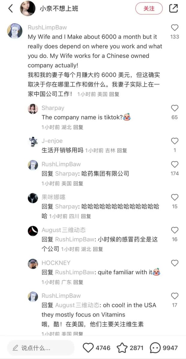 中美小紅書用户之間的交流中,最有價值的部分,就是雙方的對賬——“大家好我是來自於美國的女生,你們國家每天早上要宣讀國家誓言嗎”?“是啊是啊,我們每天早上都要喊make China great again……”“你們美國人是不是經常打兩份工”?“何止啊姐妹,我們每週工作84小時”,“什麼996?我們美國人是496,四點鐘就要上班啦”,“我們大部分人都打兩份工,我爸兩份,我兩份”,“月薪3000,房租就得1500”,“咱們叫一輛救護車就要3000美元”,“尿路感染住院一天花了19萬”,“美國警察管不管事?管,他們是保護富人的”……