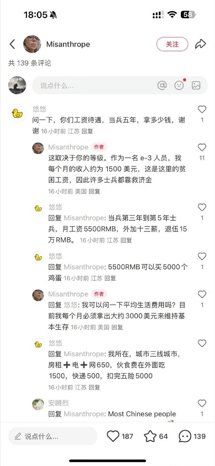 有中國網友問她在美國軍隊服役時的薪資待遇,她表示身為一名e-3人員(美國海軍的軍銜等級,e-3對應的是一等水兵),每個月的收入約為1500美元(約合人民幣11000元),這樣的收入在當地屬於貧困工資,她還表示很多士兵都得靠救濟金過活。