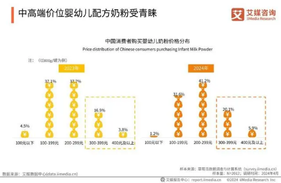其次是消費者願意為更高品質的嬰配粉支付溢價。據統計,對比2023年,2024年消費者對嬰幼兒奶粉的價格接受度有所提升,200元/罐及以上的佔比均高於2023年。