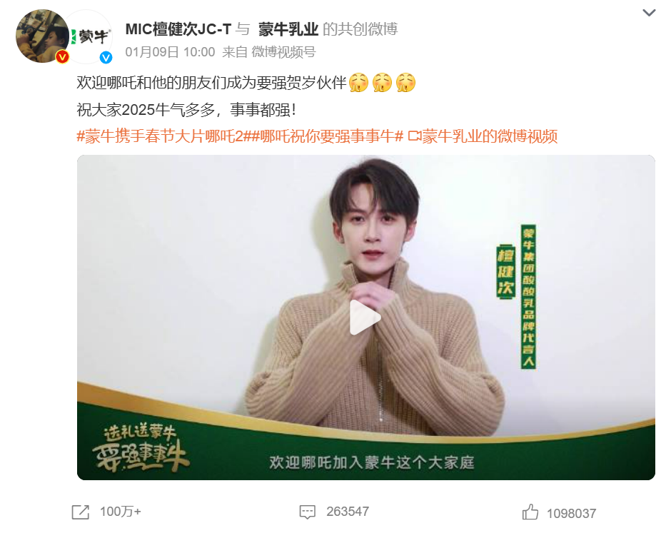 蒙牛一邊放出動畫定製廣告短片,哪吒、敖丙、太乙真人、申公豹等角色帶着蒙牛產品為觀眾們送上祝福;另一邊則是龔俊、檀健次、楊紫等蒙牛品牌代言人發佈視頻,歡迎哪吒“加入蒙牛大家庭”;此外線下超市、電梯等場景,蒙牛與哪吒綁定出現也着實刷足了存在感。