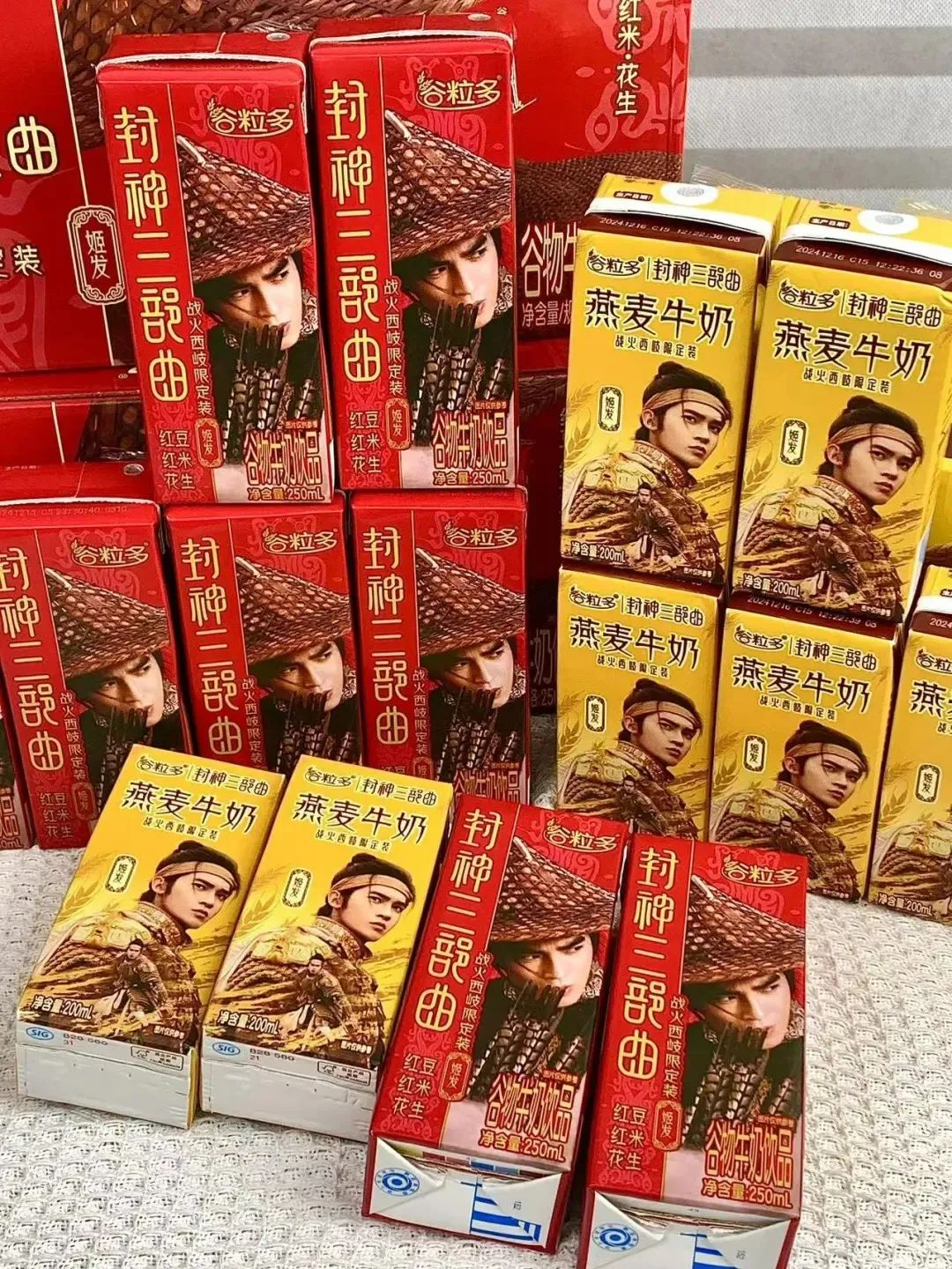 伊利與春節檔半數電影都展開了合作,只是側重終歸有些區別。這邊《蛟龍行動》只是在12月中旬官宣伊利成為乳製品行業獨家合作商,而《封神2》在1月與伊利的宣發動作就非常頻繁,伊利牛奶主打聞太師周邊,與年輕觀眾喜愛的表情包玩梗相結合,子品牌穀粒多的品牌代言人正是電影主演於適,他飾演的姬發則被印到了穀粒多新款聯名包裝上,顯然肩負着更多的“帶貨”期望。