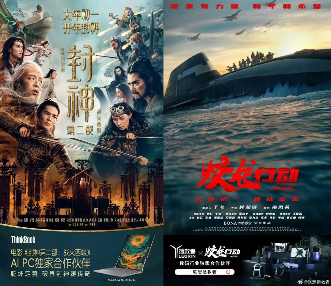 伊利、聯想這類已經為消費者熟知的大品牌,選擇“把雞蛋放在不同籃子裏”。它們旗下子品牌眾多,能夠匹配不同需求和應用場景,也分別能對應不同的影片受眾。例如主要面向遊戲玩家的聯想拯救者,是《蛟龍行動》在數碼行業的獨家合作伙伴,ThinkBook品牌定位年輕時尚羣體,此次與《封神2》展開合作。