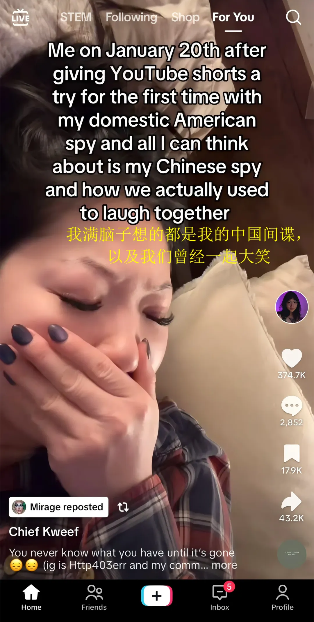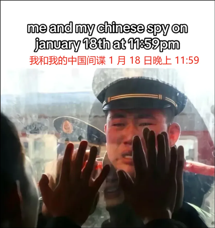 外國網友齊刷刷刷梗圖,表示害怕1月19日那天到來,因為真要和自己的“中國間諜”告別了。