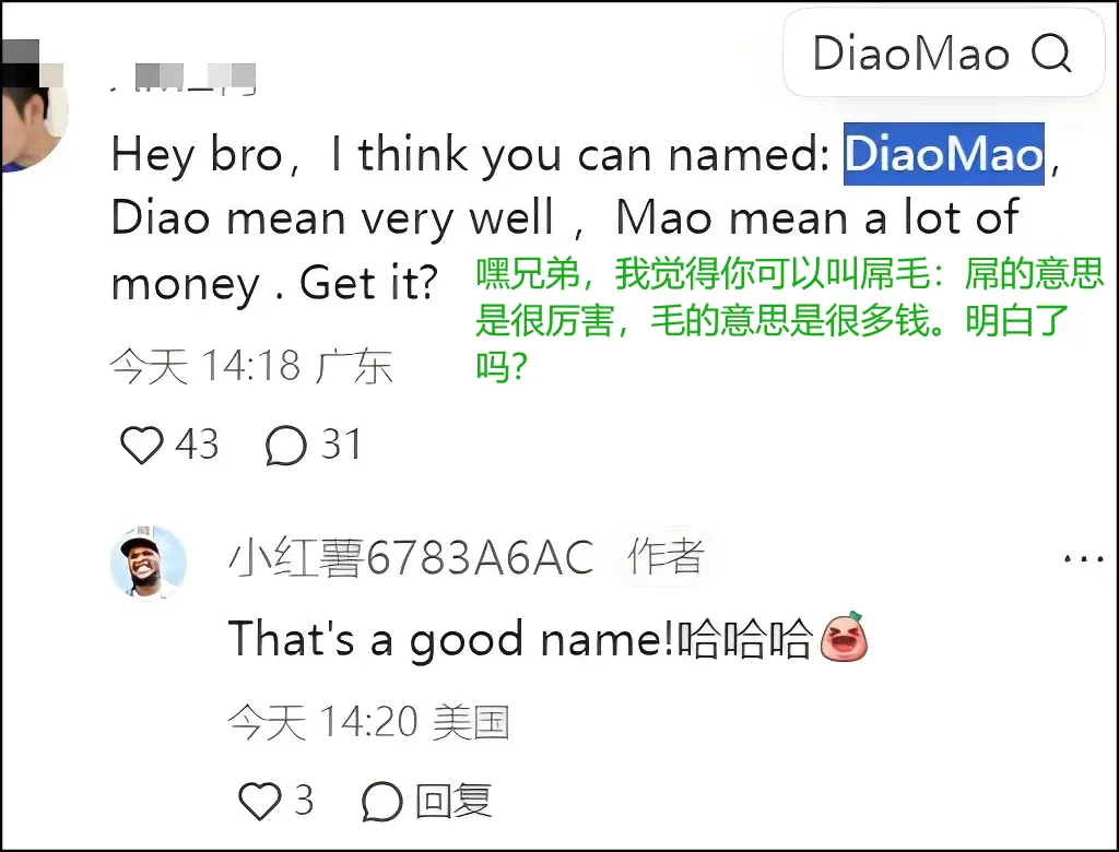 第二高贊告訴他,屌毛這名字好,屌字意為很厲害,毛字意為很有錢。