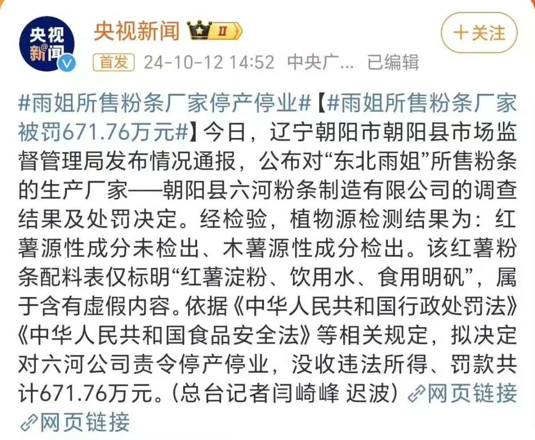 緊隨其後的東北雨姐也是十分近似的情況。早前的“稻田蟹”事件引發質疑但並未致命,9月23日卻遭到打假博主質疑所售紅薯粉其實是木薯粉,10月12日被通報存在“虛假或者引人誤解的商業宣傳”,被處沒收違法所得和罰款共計165萬元,並責令暫停經營限期整改。