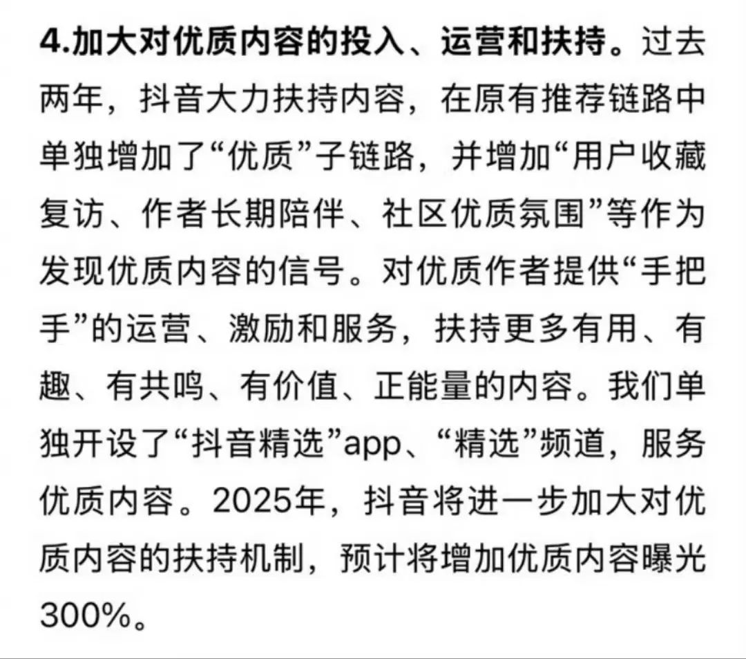 作為獨立App的成績雖然遠遠無法與紅果相提並論,但其重要性在於給用户提供更多樣化的內容選擇。其瀏覽邏輯,是對過去個性推薦單頁瀑布流的挑戰,但好處在於,巧妙回應了外界對於算法與信息繭房的質疑。2025年1月3日,抖音宣佈將推出10項措施推動算法和平台治理透明化,其中一條便是“在原有推薦鏈路中單獨增加了‘優質’子鏈路……單獨開設了‘抖音精選’app、‘精選’頻道,服務優質內容”。