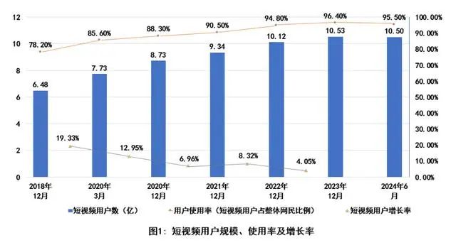 根據《中國短視頻發展研究報告(2024)》,近五年來,短視頻用户增速持續放緩,用户增長率從19.33%下降到4.05%。直至2024年上半年,用户規模首次出現回落,較2023年12月減少300萬;用户使用率也從96.40%回落至95.50%。